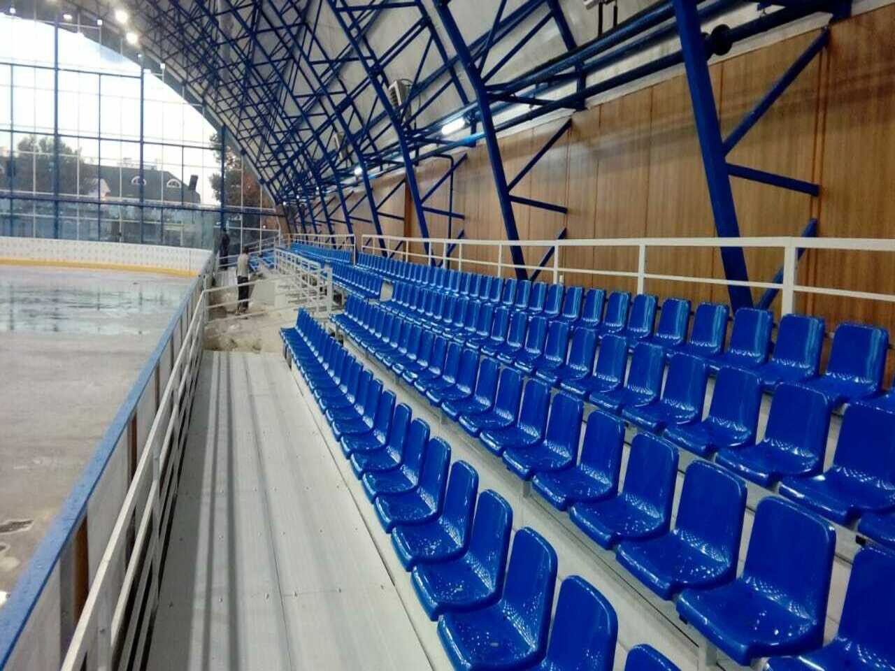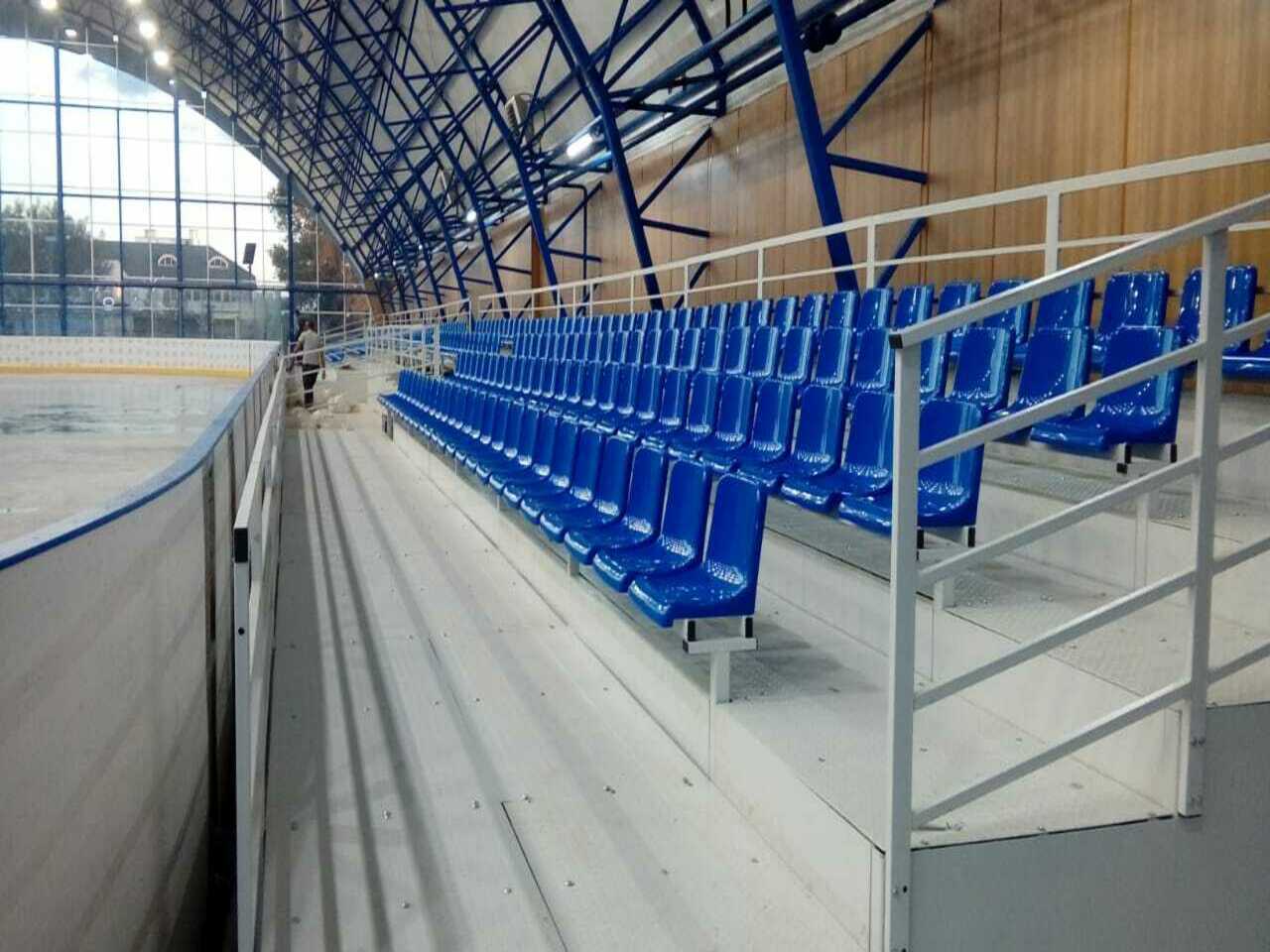На новый ледовый дворец в г. Анапа требовалась сборная трибуна на 280 мест, с подъемом первого ряда и обшивкой со всех сторон. Установка трибун усложнялась наличием куполообразного потолка.
